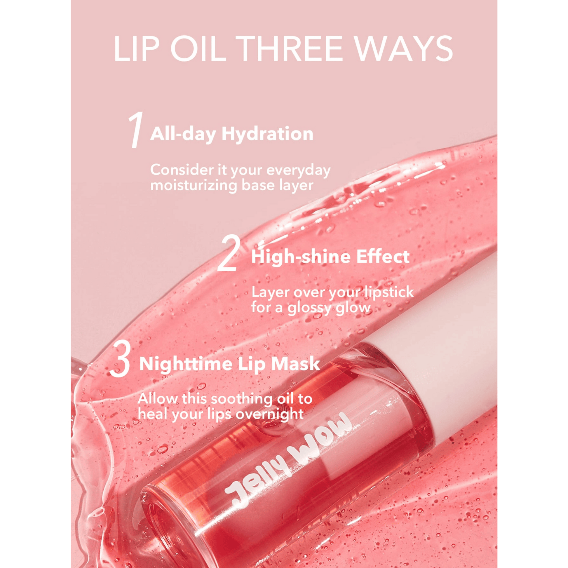 The jelly-like texture effortlessly glides on, providing a non-sticky, refreshing finish with a subtle hint of color. Ideal for daily use, this lip oil works wonders as a hydrating treatment, a light tint, or a glossy topcoat over your favorite lipstick. The Sheglam Jelly Wow Hydrating Lip Oil keeps your lips looking healthy, radiant, and kissably soft.